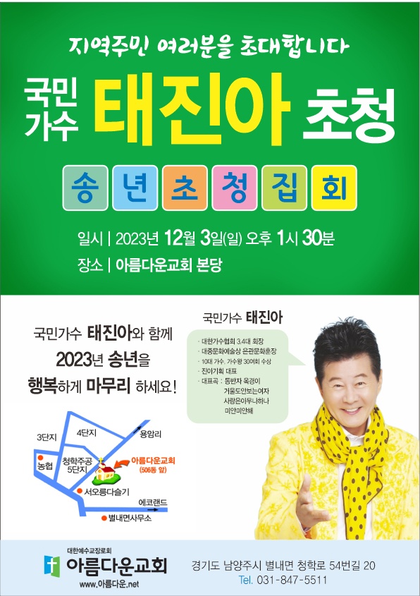경기 남양주시 별내면 청학로 54번길 20 소재 아름다운교회(방호경 목사)는 12월 3일 (주일) 오후 1시30분 교회 본당에서 국민가수 태진아 집사 초청 송년초청집회를 가질 예정이다.